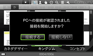 - DNH11を起動し、初回起動時は時間設定の後、付属のUSBケーブルを用いて、パソコンと接続します。DNH11がパソコンとの接続を感知すると、DNH11の画面に接続を確認するメッセージが表示されます。[接続する]を選択してください。自動で「PITREC on PC 2」が起動して、「PITREC2」フォルダが参照されます。