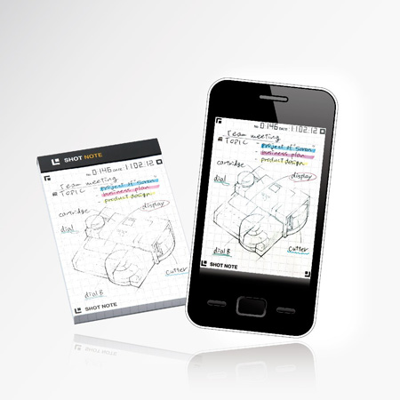 今回受賞した「ショットノート」は、“手書きメモをすっきりデジタル化”をコンセプトに開発された、手書きノートとスマートフォンが連携する新しいノートです。手書きメモをスマートフォンの専用アプリ(無料)を使って撮影すると、アプリがショットノートの四隅のマーカーを読み取って台形補正や色補正、サイズ補正を自動で行い、ノートを画面ぴったりに取り込めます。取り込んだノートはメールで送ることや、「Evernote」や「Twitter」、「Dropbox」に投稿して保存・共有することもできるので、メモの整理・活用をより簡単に行うことができます。