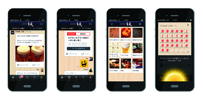 ニュースレター配信 お店の最新情報や、オススメ食材、新入荷情報などを、写真付きで簡単に 告知できます。 クーポン付レター配信 期限を設定したり、お店の混雑状況などに応じたリアルタイムな配信はちろん、誕生日などに合わせて自動的にクーポンを送ることも可能です。 フォトギャラリー 送った写真をリスト化して表示できるので、写真付きメニューとしても活用できます。 スタンプ機能 アプリ起動や情報のシェア、友達紹介などに対してスタンプを付与することができるので、お客様にアプリの利用を促すことができます。 お店情報 地図アプリと連動し、お店の位置を表示します。また、営業時間や電話番号なども表示でき、お客様をスムーズに誘導できます。 ソーシャル機能 コメントを返信したり、SNSにシェアしたり、お客様とつながる機能も備えています。 - 料金は、オリジナルアプリのダウンロード数に応じた従量課金