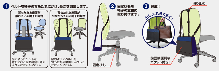 「イスの後ろのカバン置き」の取り付け方は、本体のベルトをオフィスチェアの背もたれにかけ、長さを調整し、固定用のひもをオフィスチェアの支柱に付ければ完了です。ベルトの高さや取り付け方を自由に調整できるため、様々な形状、高さのオフィスチェアに対応可能です。また、前面には書類などを一時的に収納できるポケットが付いています。
