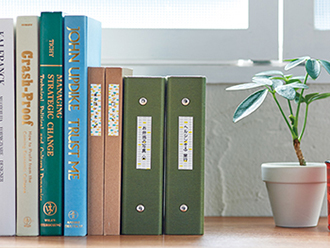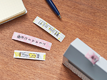 - 印刷の向きを、「たて・よこ」で切り換えることができるため、アルバムやファイルの背表紙などに貼るラベルも、よりスマートに作成できます。また、カットボタンを搭載しているので、はさみを使わずにテープをカットできます。