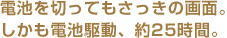 パソコンのように電源を切るたびに保存する必要はありません。電源を入れると先ほどの画面が表示されます。しかも電源は単4形アルカリ乾電池2本。コンビニエンスストアや駅の売店などで手に入るので、外出先での電池切れの心配もありません。