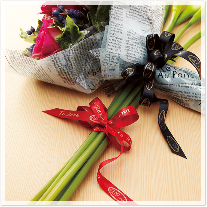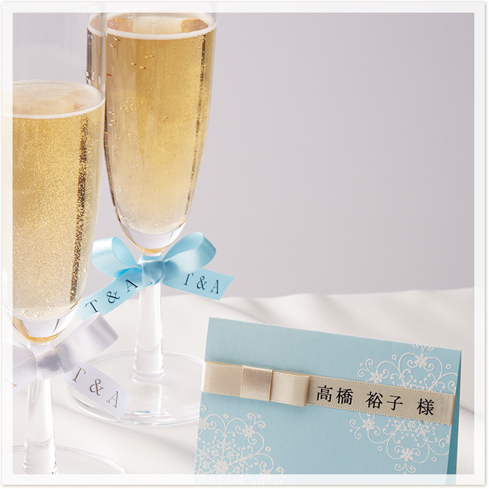 ウェディングなどのパーティーをオリジナルりぼんで自分らしく演出。記念日やお名前も入れられます。
