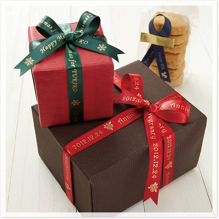ギフトボックスをオリジナルりぼんですてきにデコレーション。メッセージなどを印字すれば気持ちもしっかり伝わります。