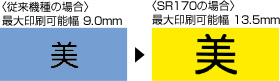 従来機種(SR150)に比べ、最大印刷可能幅は9.0mmから13.5mmに拡大、文字サイズが5段階から6段階となり、より大きい文字が印字できるようになりました。