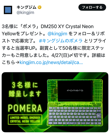 ユーザーアンケートの結果をもとに、最も人気の高かった「透明」仕様のポメラを開発しました。これまでの限定モデルとは一線を画す、鮮やかなネオンイエローの透明ボディを採用しています。Xではプレゼントキャンペーンを実施し、その後の抽選販売でも多くの応募が寄せられました。