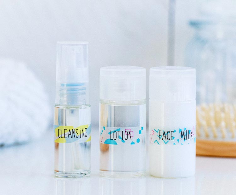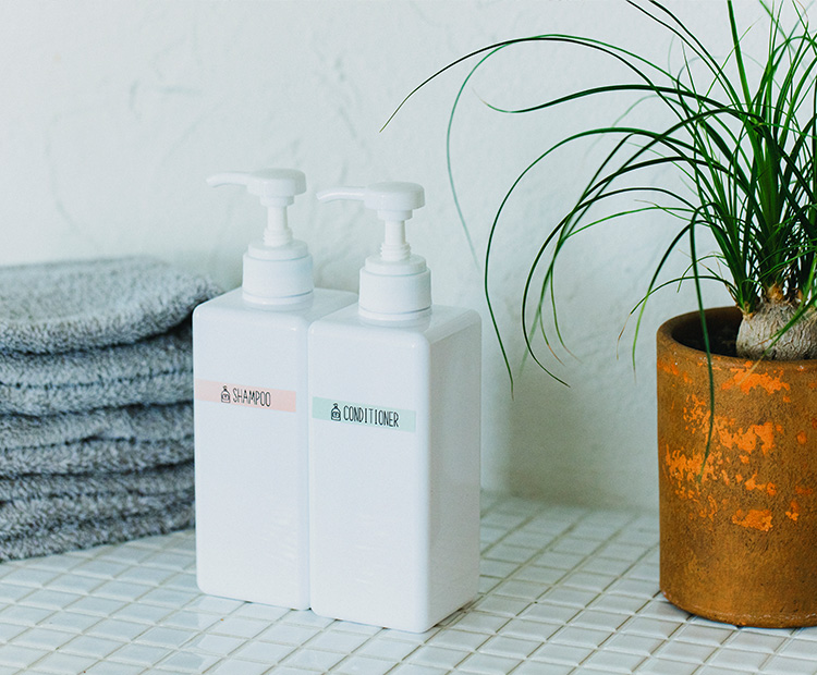 水回りのボトルにラベリングシャンプーなどの詰め替えボトルに、ラベルを貼ってわかりやすく。シンプルな容器にも、ちょっとしたアクセントと統一感が生まれます。