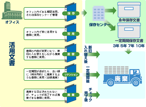 進行していたが不要になった文書・活用文書だったが利用価値が下がったもの・保存期間を過ぎた文書など、各ステップごとに、誰もが捨てられる効率のよい「廃棄システム」を紹介。