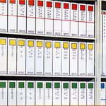 書類の発生から廃棄までの一貫した管理と、情報の共有化を図るため採用したオープンファイリングシステムは、“捨てリング”を合言葉に、まずは不要文書を処分することからはじまりました。次に文書分類基準を作成し維持管理ルールを徹底化。さらに色で業務内容を、数字でロケーションを把握できる検索機能をキングファイルの背見出しに付加しました。大量なファイルの統一された背見出しを作るにはテプラが活躍しました。こうした緻密なプロセスを経て、維持管理のしやすいシステムの構築と書類の取り出し時間短縮を実現させたのです。