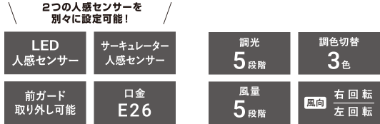 センサーは直径約4mの範囲で人を感知。1分間以上、無人になれば自動オフして節電対策も◎。照明とサーキュレーターで別々に設定が可能です。