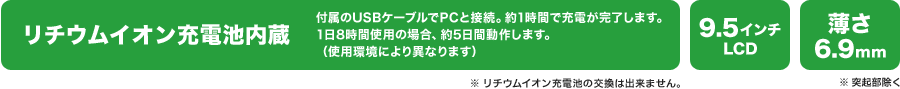 ![[リチウムイオン充電池内蔵 付属のUSBケーブルでPCと接続。約1時間で充電が完了します。1日8時間使用の場合、約5日間動作します。(使用環境により異なります)※リチウムイオン充電池の交換は出来ません。][9.5インチ LCD][薄さ6.9mm※突起部除く]](/sp/boogieboard/images/bb3/img02.png)
