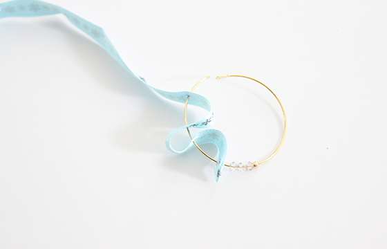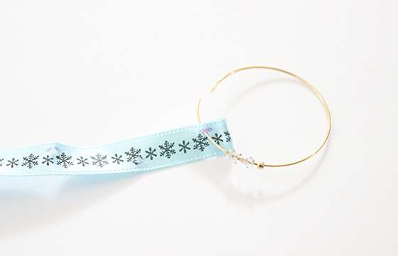 つぶし玉1個とビーズ3個をピアスの端から通し、続けてリボンの表側から、いちばん端の穴にピアスを通す。