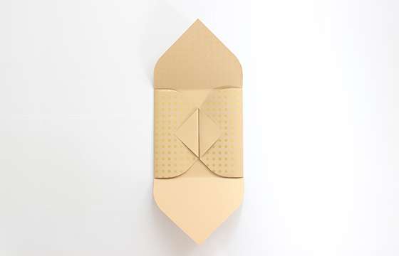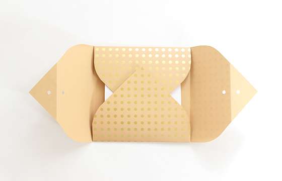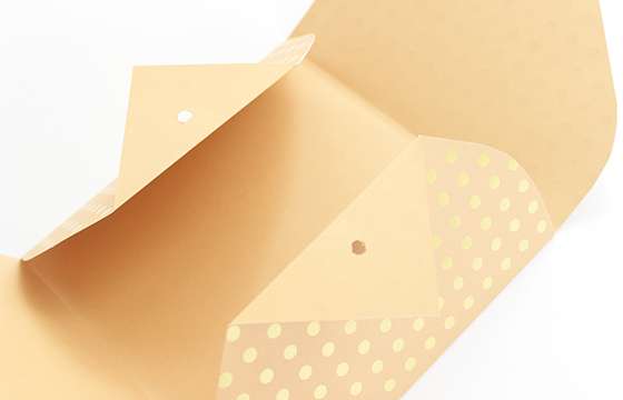 一度開いて品物を入れ、上下の穴が開いていない部分を重ねるように折りたたむ。