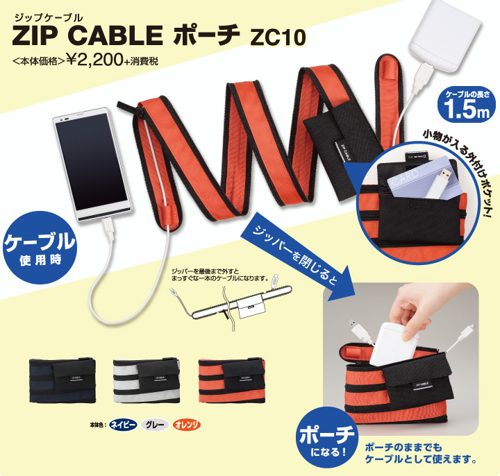 ZIP CABLE ポーチ ZC10 ケーブルの長さ1.5m 本体価格 ¥2,200+消費税 発売日:2014年6月13日 ジッパーを最後まで外すとまっすぐな一本のケーブルになります。 小物が入る外付けポケット! 本体色:ネイビー グレー オレンジ