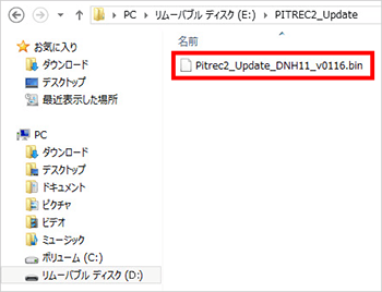 Pitrec2_Update_DNH11_v0116.bin〕は、microSDカードのフォルダ{PITREC2_Update}内に保存してください。- ※別の場所へコピーした場合、アップデートすることはできません。