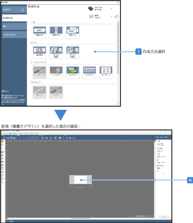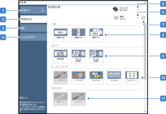 横書きラベル、縦書きラベル、複数ラベルを新規で作成するときに選択します。 |