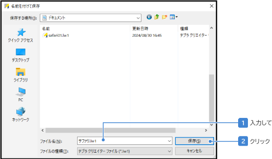 作ったラベルの保存は、現在のファイル名でそのまま保存する「上書き保存」と、別のファイル名を入力して保存する「名前を付けて保存」があります。