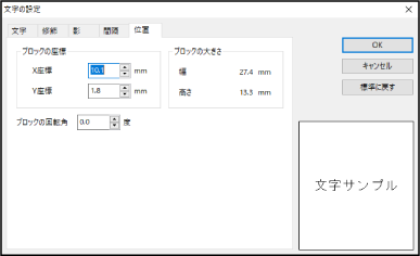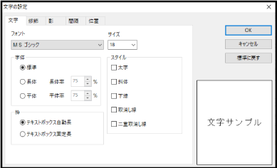 [文字の設定]画面は、テキストブロックを選択してメニューバーの[編集]−[プロパティ]をクリックまたは、テキストブロックを右クリックして[プロパティ]を選択すると表示されます。