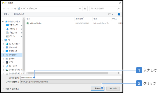 作ったデータは、データのみを保存する方法(「XLS形式」、「XLSX形式」、「TXT形式」、「CSV形式」)と、レイアウトしたラベルごと保存する方法(ラベルデータの保存)があります。