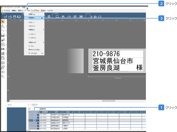 削除する行または列をクリックして選択し、[データ]の[行削除]または[列削除]を選択する