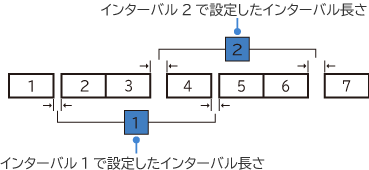 ポート間隔を広げるときに設定します。 「インターバル1(2)」でインターバル間のポート数を、「インターバル1(2)長さ」でポート間隔を入力します。インターバルは最大2パターン同時に設定可能です。インターバル2を設定した場合、「インターバル1」と「インターバル2」が交互に適用されます。