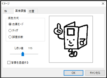 イメージファイルがカラーデータの場合に2値化(白/黒への減色)方法を選択します。 |