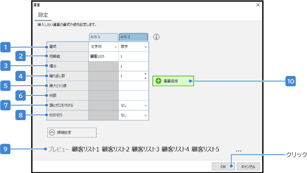 続いて「連番追加」をクリックします。追加されたA/S2の「書式」を「数字」にし、「初期値」「増分」「繰り返し数」をすべて「1」に設定します。