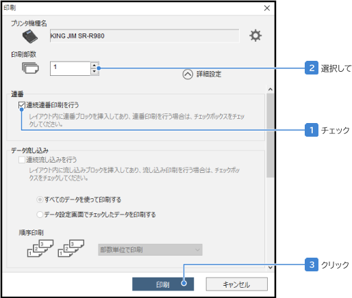 「連続連番印刷を行う」にチェックマークをつけ、印刷部数を指定します。