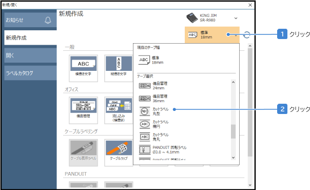 新規に作成するときは、[新規/開く]画面の「テープ幅」でカットラベルを選択します。