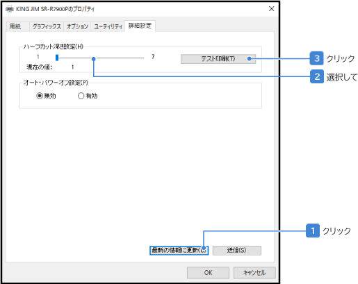 ハーフカット深さを設定し、テスト印刷ボタンをクリックします。
