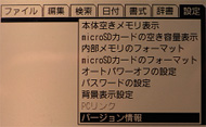 電源を入れ、menuキーを押し、右矢印キーで「設定」タブに移動し、▼キーで「バージョン情報」にカーソルを合わせます。