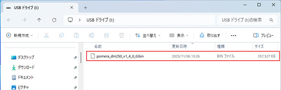 アップデートプログラム(pomera_dm250_v1_4_0_0.bin)をSDカードへコピーします。