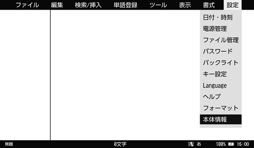 - 3.電源を入れ、「Menuキー」-「設定」-「本体情報」を選択して、「Enterキー」を押す。