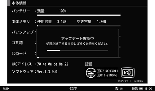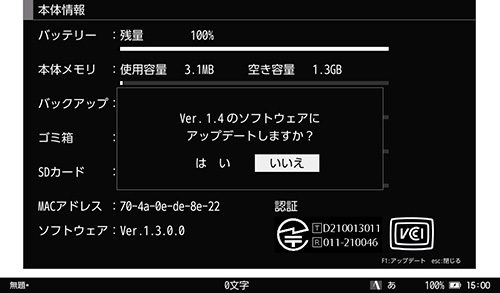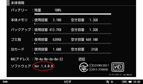 「ソフトウェア:Ver.1.4.0.0」と表示されていれば、アップデート成功です。