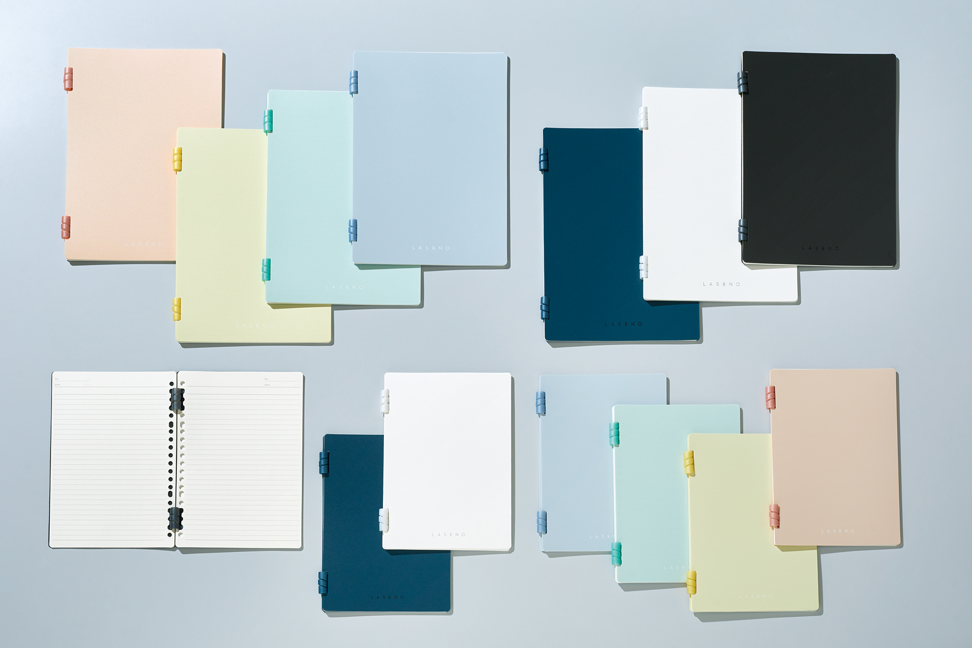 LASENO is a new type of ring notebook with newly invented flexible spirals. The spirals slip off smoothly when pulled out, and loose-leaf paper can be replaced or added. They provide a comfortable writing experience as they are soft and separated upper and lower so that they do not block your hand. Like ordinary notebooks, its cover can be turned 360 degrees.