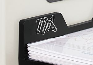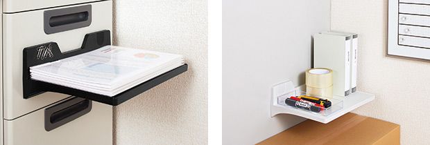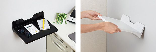 トレー部分が約230×320mmで、A4書類もクリアーホルダーに入れたまま、はみ出すことなく平置きできます。デスクの引き出しなどに取りつけて、一時的に置いておきたい書類や文具、ティッシュなどを置けるほか、オフィスの共有スペースでは、スチール製のキャビネットや本棚などに取りつけ、筆記具や梱包用テープ、運送伝票などの共有備品置き場としても活用できます。
