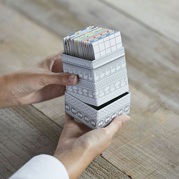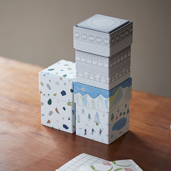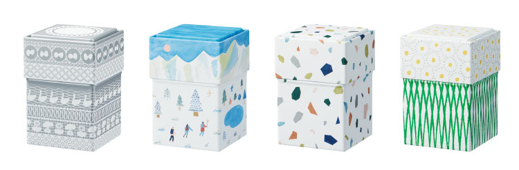 今回、「KITTA(キッタ)」を家で収納・保管する際に最適な、専用の収納缶「KITTA CAN(キッタカン)」を発売します。1個につき約15冊の「KITTA(キッタ)」を収納可能です。また、フタの部分に溝があるため、複数の缶を積み重ねることができます。ラインアップは、北欧風なデザインの「ヤマ」や、マットな銀の印刷がほどこされた「レース」など計4種類です。