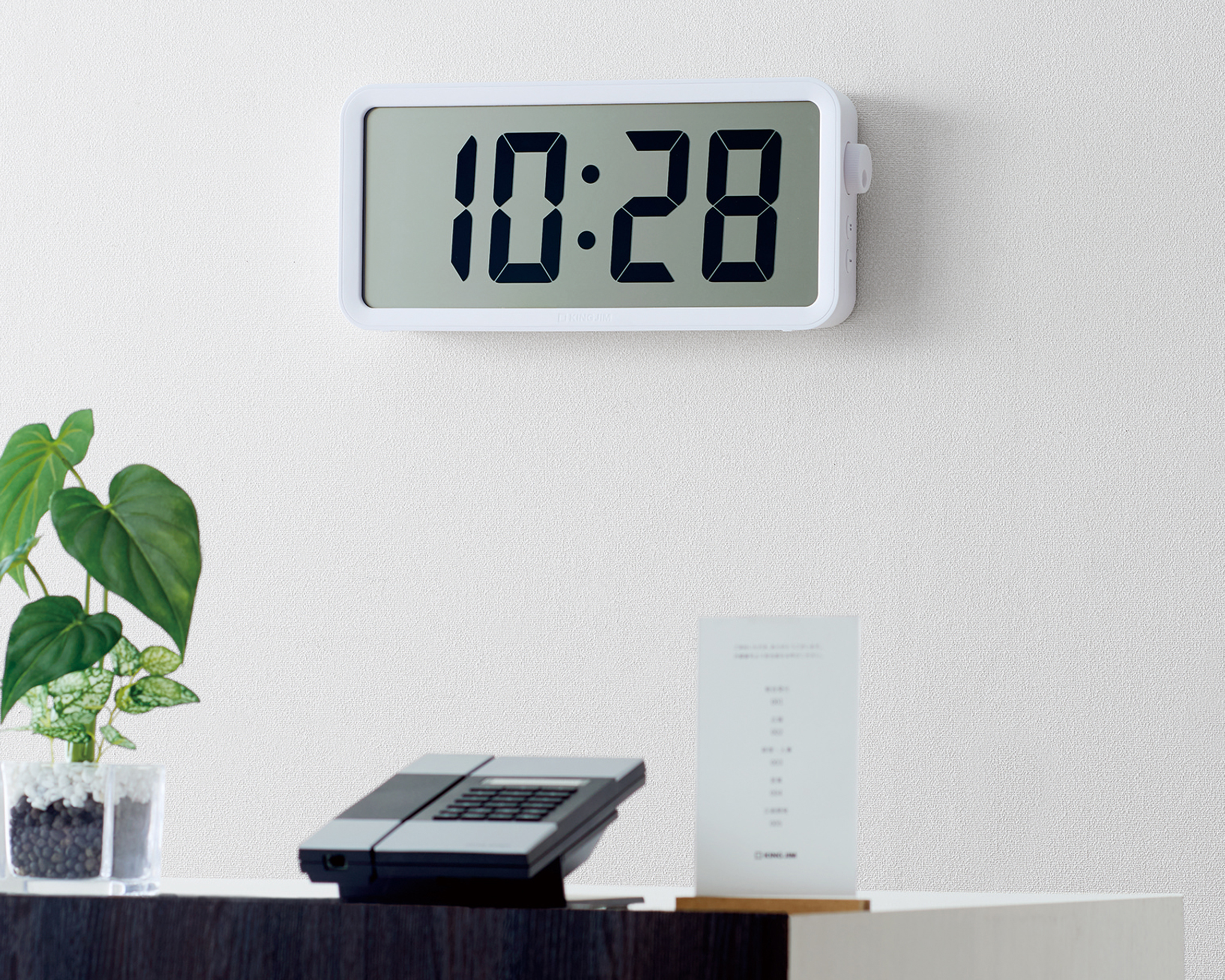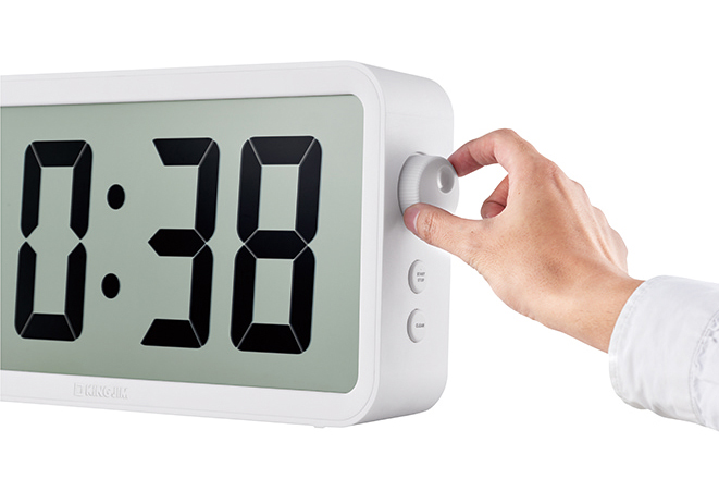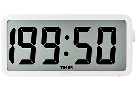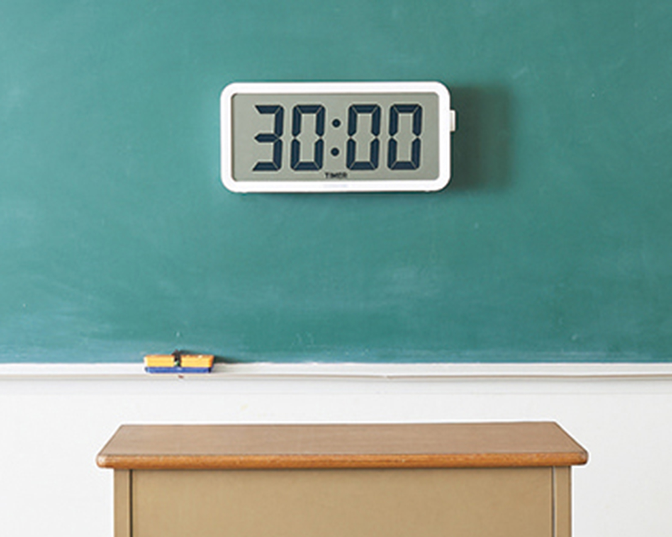 「ザラージ タイマークロック」は、約(W)388×(H)164mmの超大型液晶を搭載したタイマー兼電波時計です。画面をシンプルな表示にすることで、遠くからでも数字を読みやすくしました。タイマーはダイヤルを回すだけてで簡単に設定でき、最大199分50秒まで設定可能です。また、日付の表示やアラームの設定、ストップウォッチとしても使用できるため、学校・学習塾でのテストやグループ学習、工場やオフィスでの時間管理を必要とする場面に最適です。