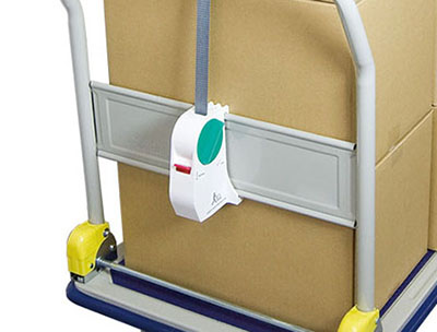 「台車につける安心ベルト」は、市販の台車に取り付けて内蔵のベルトで荷物を固定することで、荷物の落下や荷崩れを防ぐことができる製品です。