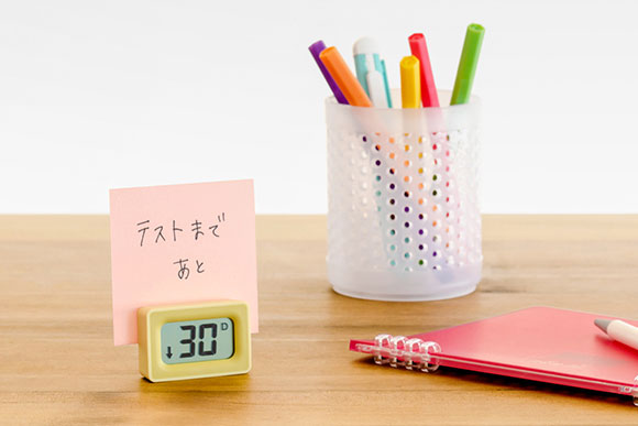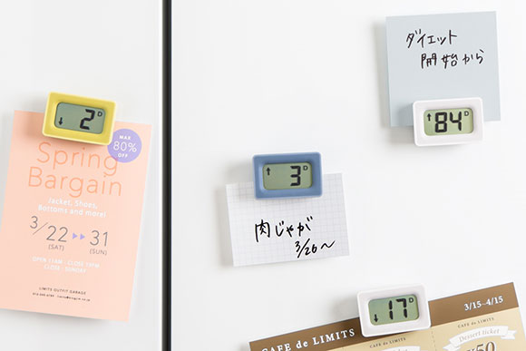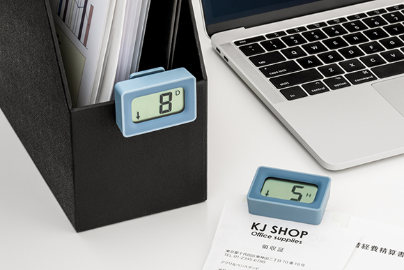 クリップタイマー「リミッツ」は、99日まで計測できる長期タイマーとメモが挟めるクリップを組み合わせた、新しい形のタイマーです。"時間"と"メモ"をまとめて確認できるため、忘れてしまいがちな期日や期限を意識付けながら管理できます。タイマーは、カウントダウンとカウントアップの2種類を備えています。カウントダウンでは目標とする日にちまで「あと何日なのか」を計測でき、カウントアップでは対象の日にちから「何日経過したのか」を計測できます。共に最大99日の長期計測が可能で、カウントダウンは日にちのほか、時、分それぞれの単位でも設定できます。本体のクリップには計測中の内容を記したメモや、期日までに仕上げる書類などを挟むことができます。クリップは上下を反転させられるため、上向きにクリップをつけて卓上のメモスタンドとして使用したり、下向きにクリップを付けてボックスファイルなどに挟んだりできます。また、マグネットが付いているので、デスクのスチール面や冷蔵庫に貼りつけることも可能です。