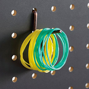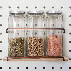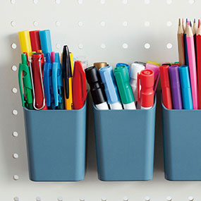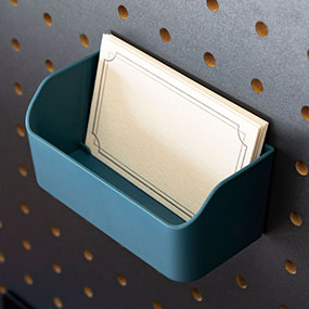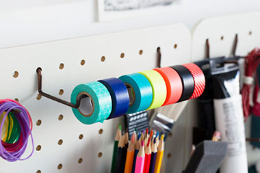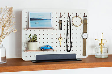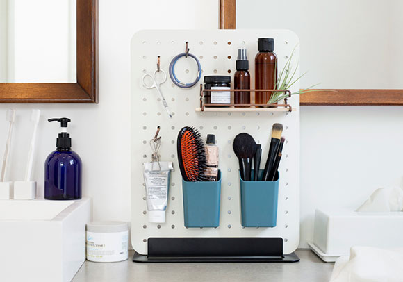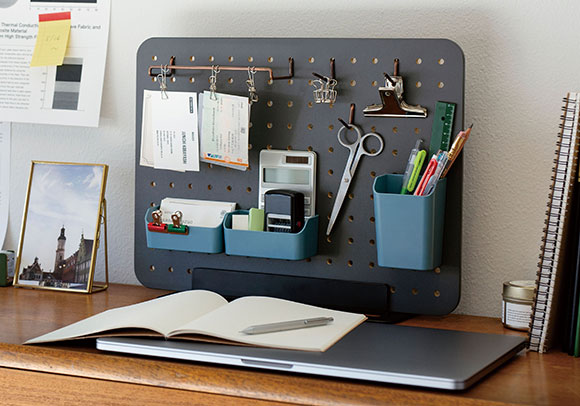 パーツを自由に取り付けてカスタマイズできる、ペグボートを使った卓上収納ボード