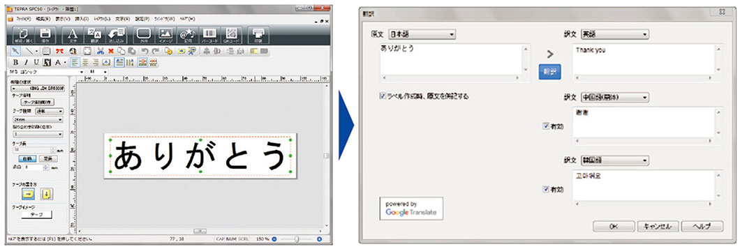 「SPC10」はパソコン上でラベルのレイアウトや文字の編集ができ、デザイン性の高いラベルを簡単に作成できるPCラベルソフトです。翻訳機能は、ラベルソフト上で文章を入力するだけで、英語、中国語をはじめとする15か国語の多言語ラベルを簡単に作成することができます。