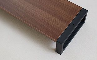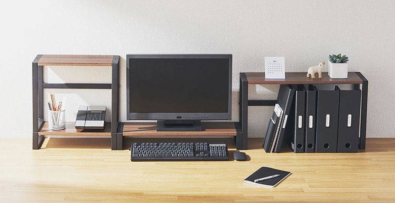 今回、新たに発売する木製タイプは、インテリアで人気のあるウォールナット調の木目デザインを採用しました。サイズはテンキー付きのキーボードも収納できるロングタイプと、ペン立てなどの小物を収納して狭いスペースでもすっきりと置けるショートタイプの2種類で、高さはそれぞれハイタイプとロータイプの計4サイズをご用意しています。デスクの広さや用途に合わせて、自由に組み合わせて使用できます。また、付属のパーツを取り付けることで、積み重ねて使うこと※も可能です。それぞれ奥行きは200mmとスリムなため、場所をとらず、机の上を広々と使用できます。