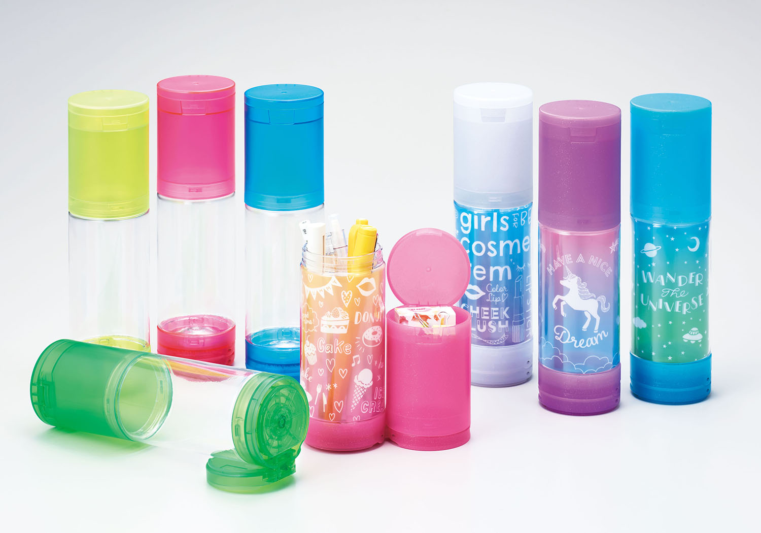 今回、数量限定で発売する「オクトタツ」はティーン層にも親しみやすいネオンカラーとファンシーの2種類を追加します。ネオンカラーは、キャップと底面部分にトレンドの蛍光カラーを採用し、本体は収納したペンなどが見やすい透明タイプです。ファンシーは、キャップと底面部分にラメ入りカラーを採用し、本体には取り外し可能なイラストシートが入っています。