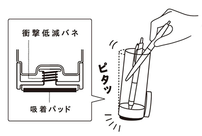 - 本体底面の"吸着パッド"と"衝撃低減バネ"により、机にしっかりと密着してたおれません。