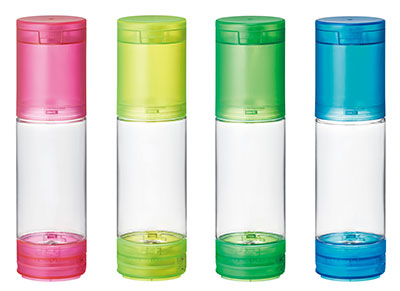 - 透明タイプの本体です。キャップ、底フタ部分はトレンドの蛍光カラーを採用しました。