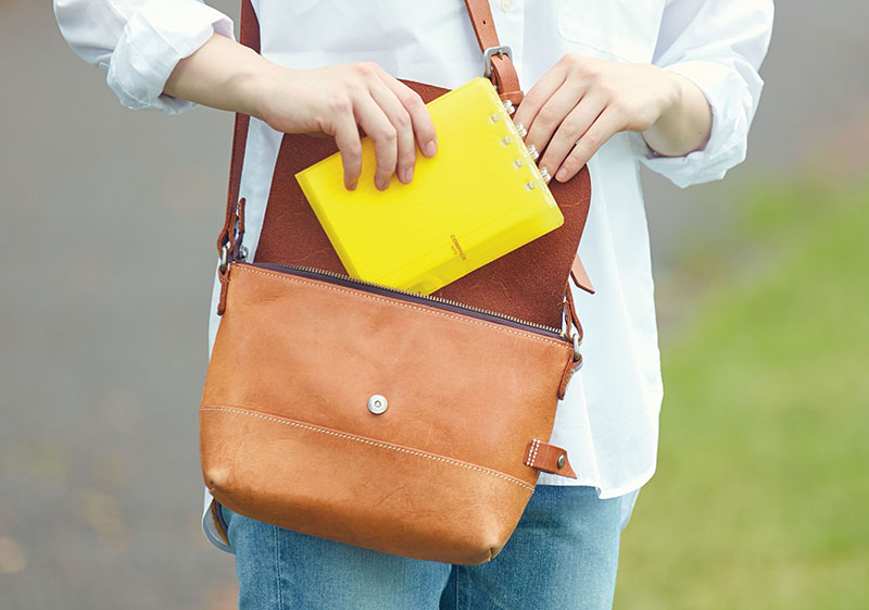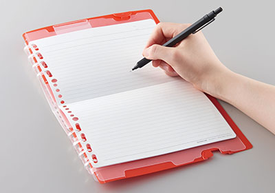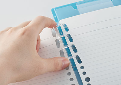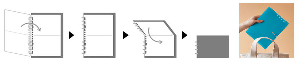 二つ折りリングノート「コンパックノート」は、持ち運びや収納する際は半分に折ってコンパクトになり、開くと通常のリングノートと同様に綴じたルーズリーフをめくって閲覧や書き込みができるノートです。専用のルーズリーフに、ノートの開閉に合わせてスライドするオリジナルの穴形状を採用したことで、ルーズリーフを綴じたままきれいに二つ折りできます。また、折りたたんだ際に表紙が開かないように、表紙とリングに留め具が付いています。