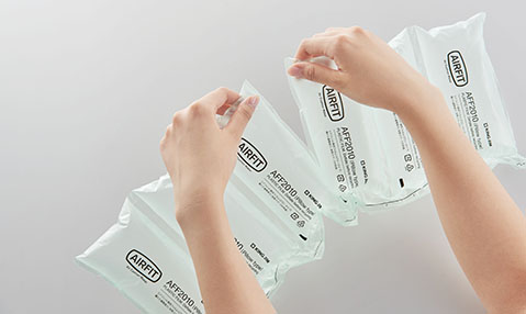エアクッションメーカー「エアフィット」は、オフィスやご家庭でエアクッションを簡単に作成できる梱包材製造機です。専用フィルムを使用し、必要な分だけ空気を入れ膨らませて作成できるため、一般的なエアキャップなどに比べて梱包材の保管スペースを削減できます。また、本体もコンパクトなため場所をとりません。作成したエアクッションは、空気を抜けば小さくなるため、使用後の処分も簡単です。
