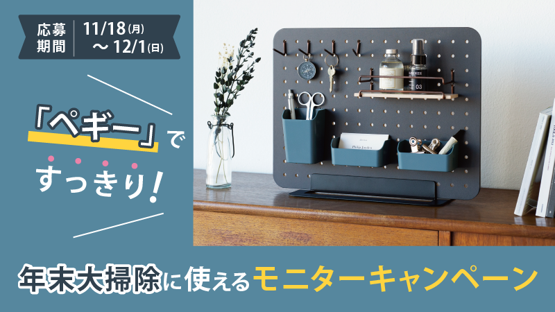 | キャンペーン概要 | 「今年中にスッキリさせたいこと」をコメントしてくれた方の中から、抽選で20名様に卓上収納ボード「ペギー」を、別売のパーツとセットにしてをプレゼントします。 |