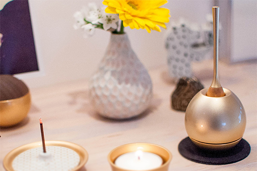 たたずまいはまるでオブジェのようなおりん。上部の穴にりん棒を立てておさめるようになっていますが、たたいた後すぐにりん棒を戻しても、音が鳴りやみません。